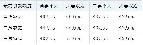 普通家庭:购买首套自住住房个人最高贷款额度为40万元,夫妻双方最高贷款额度为60万元;购买二套自住住房个人最高贷款额度为30万元,夫妻双方最高贷款额度为45万元。